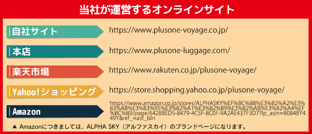 上記の5サイトを運営しております。 (auPAYマーケットは2023年5月末日で閉店いたしました。) その他のサイトに、plusone voyage (プラスワン・ヴォヤージュ)が表示されていたとしても、 当社とは一切の関わりはございませんので、 くれぐれもご注意くださいますようお願い申し上げます。 |